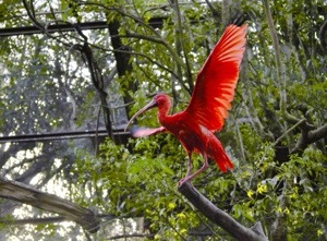A bright red flamingo-type bird