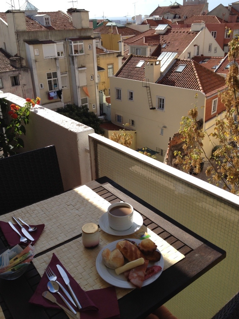 After this, we walked about another 20 minutes back to our B&B. Waiting on our beds was a bottle of Vihno Tinto (or red wine) as a welcome gift from our B&B. So we had a mini-glass while sitting (where else?) on the rooftop overlooking (what else?) the Lisbon rooftops. I could easily get used to this…