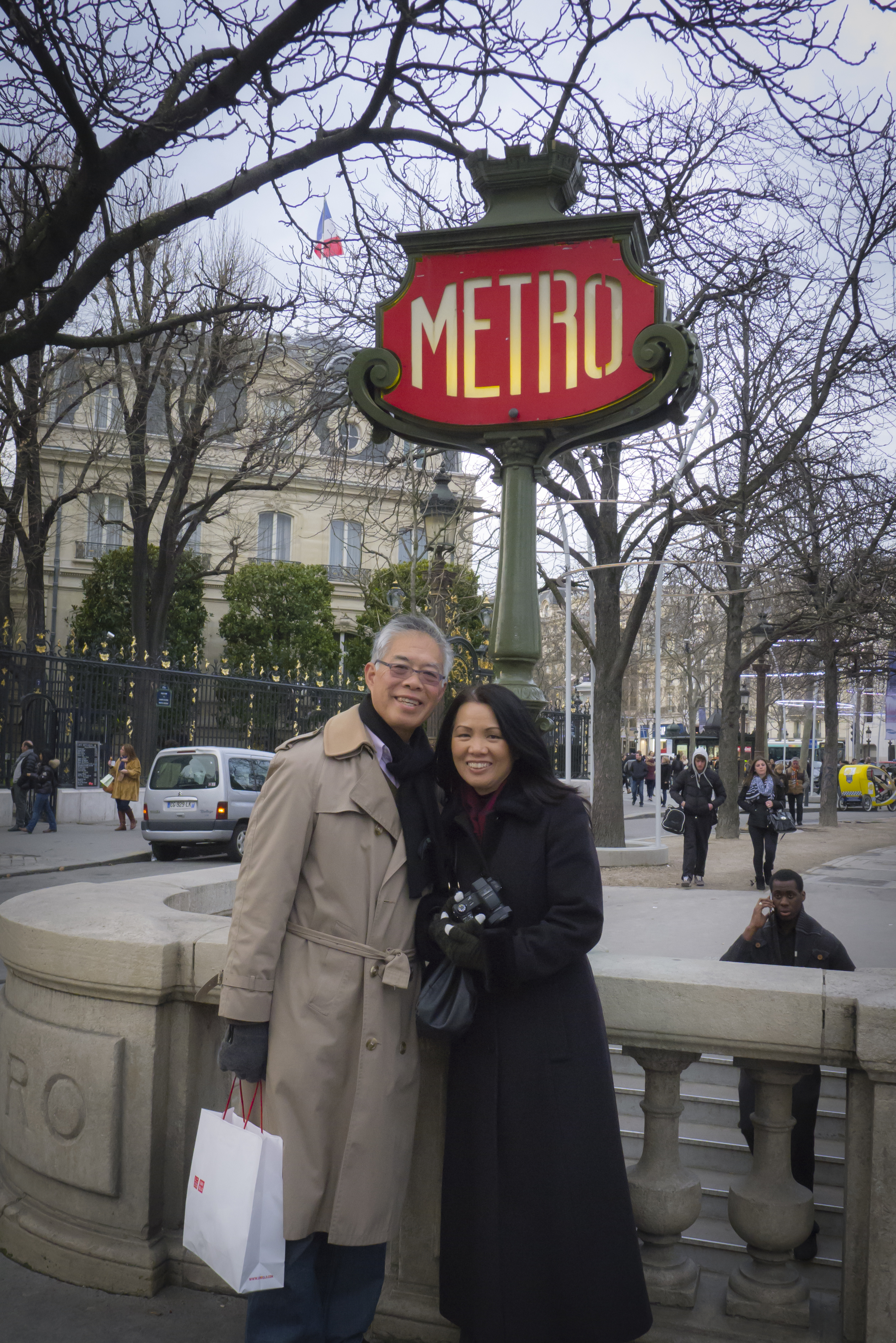 Our last day in Paris and we still did not eat a French meal. Instead, I found a Chinese restaurant with good reviews and took my parents there. Since my dad was fighting a cold, we figured that some hot n’ sour soup would be good for him. It was a Saturday, so I decided to attempt driving in the city, and the trip was relatively uneventful compared with our first foray into Paris. The only exciting moment came while driving through a multi-lane roundabout with about 7 busy streets feeding into it. Crazy. After negotiating that stressful roundabout, I decided to pull into the nearest parking garage to get rid of the car, which happened to be under a mall. We parked the car, and found out that the mall was actually offering free parking for the holidays. Free parking in Paris!?!?!?! Unheard of. So we left the car there and continued the rest of our day on foot and Metro.