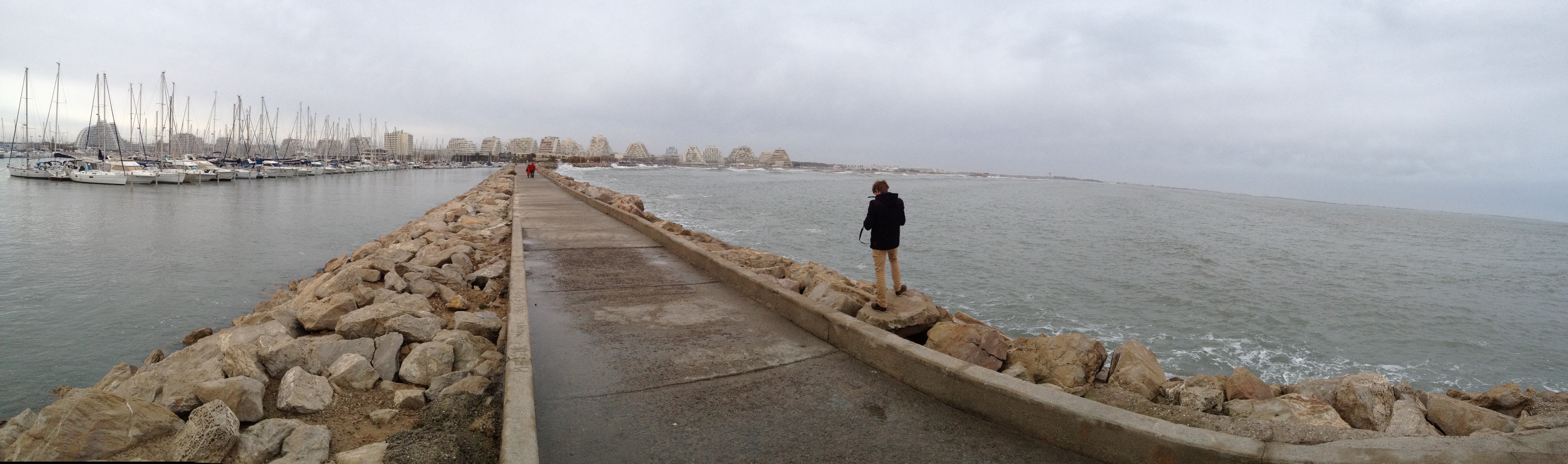We thought we had a great opportunity last week on Wednesday. In the morning, the sun was shining and it was actually WARM(!!!!), for the first time in 2 months. (Anything above 55 degrees is “warm” to us now…) So we made plans to visit the beach with friends in the afternoon. However, the afternoon came around and the sun was gone. In its place was plenty of clouds and a chilly cold wind. (Kind of like the capricious weather of San Francisco…) Not to be deterred, we headed to the beach anyway. Our friends took us to a beach town about a 15 minute drive from Montpellier called La Grande Motte. Despite the change in weather, we found quite a few people there, walking along the boardwalk. There were no chances of us getting on the beach itself, as we saw the beach being violently attacked by the waves. (Apparently, the violent waves were a residual from a storm further east in Nice…)