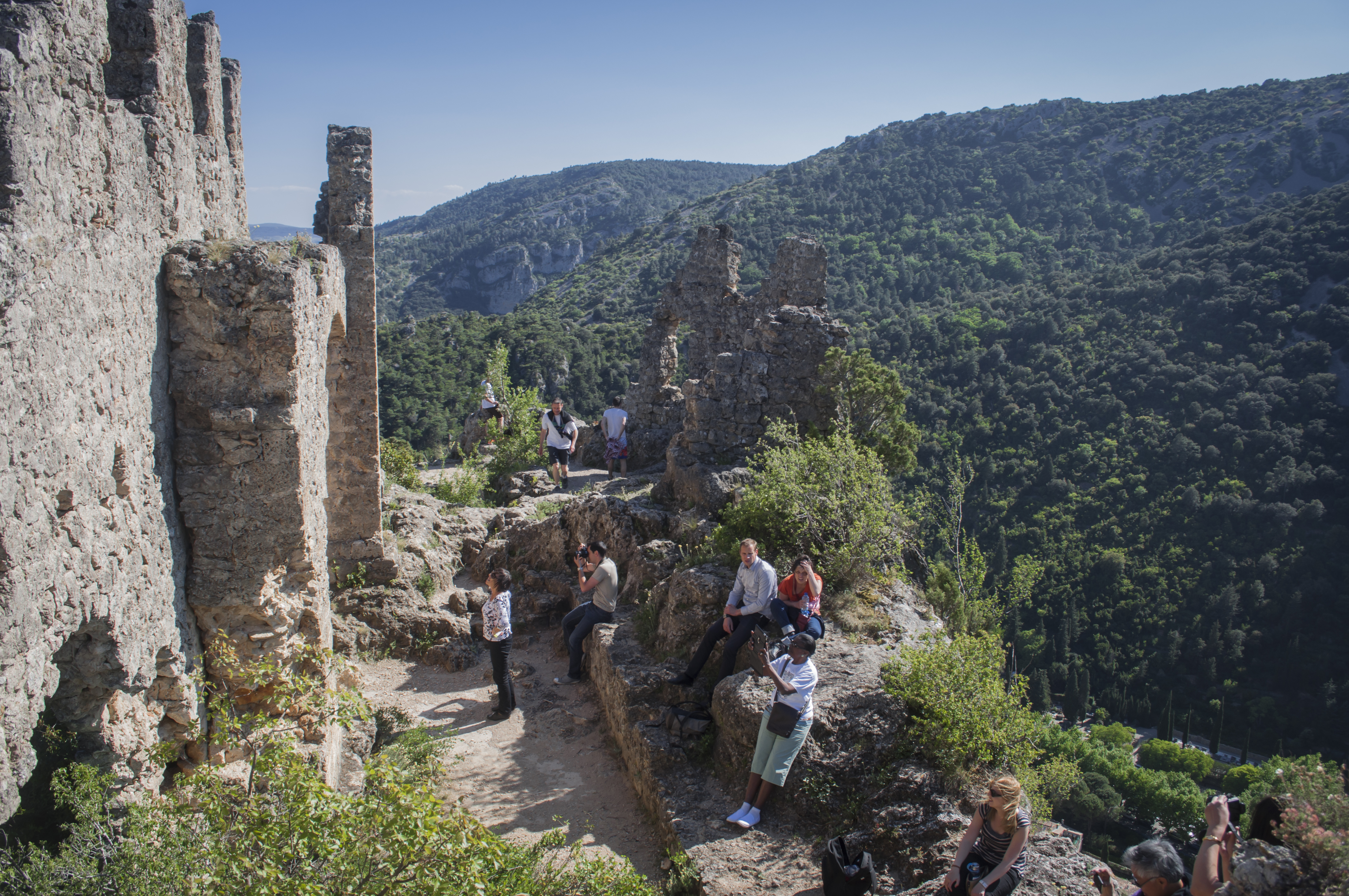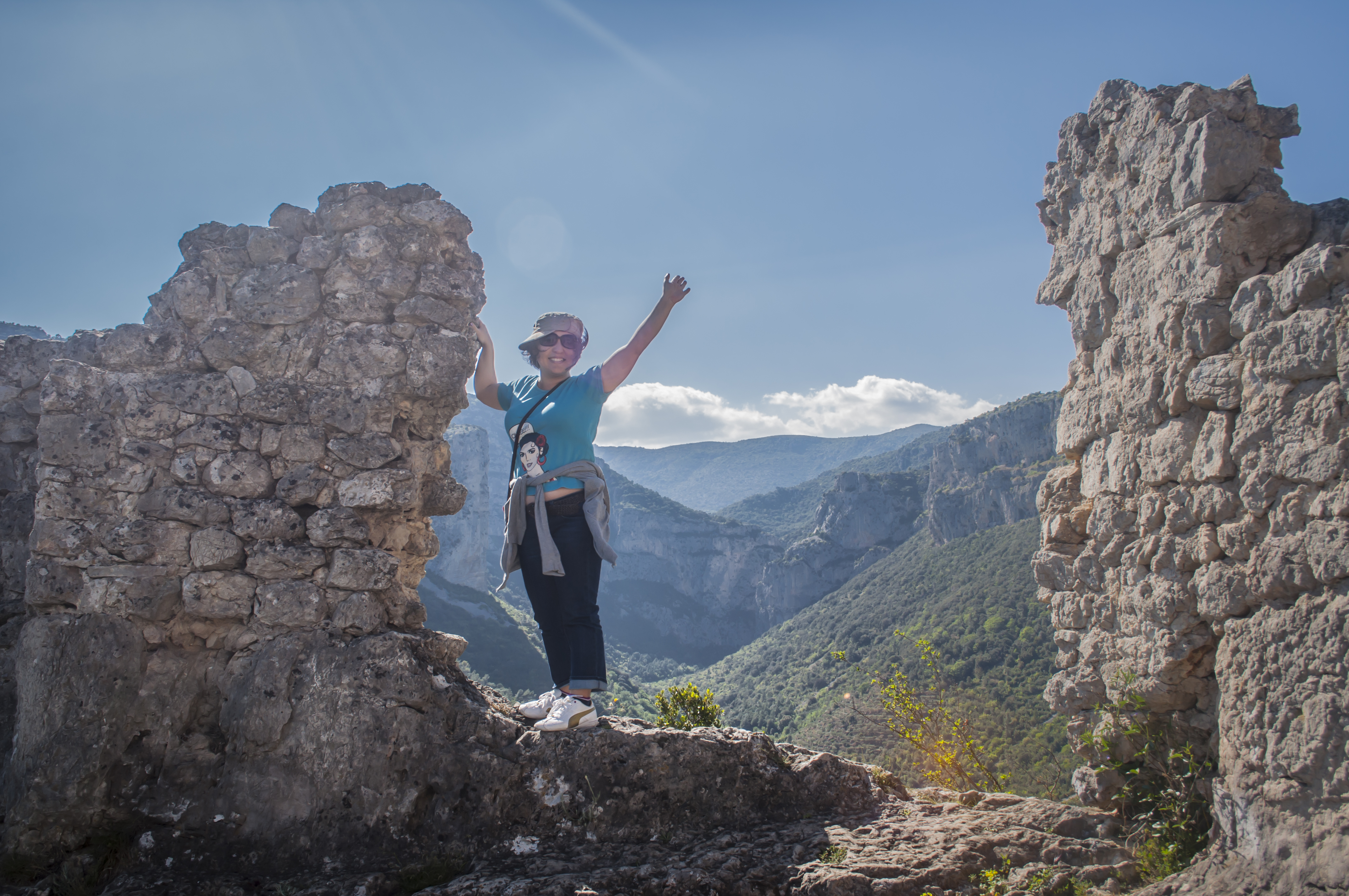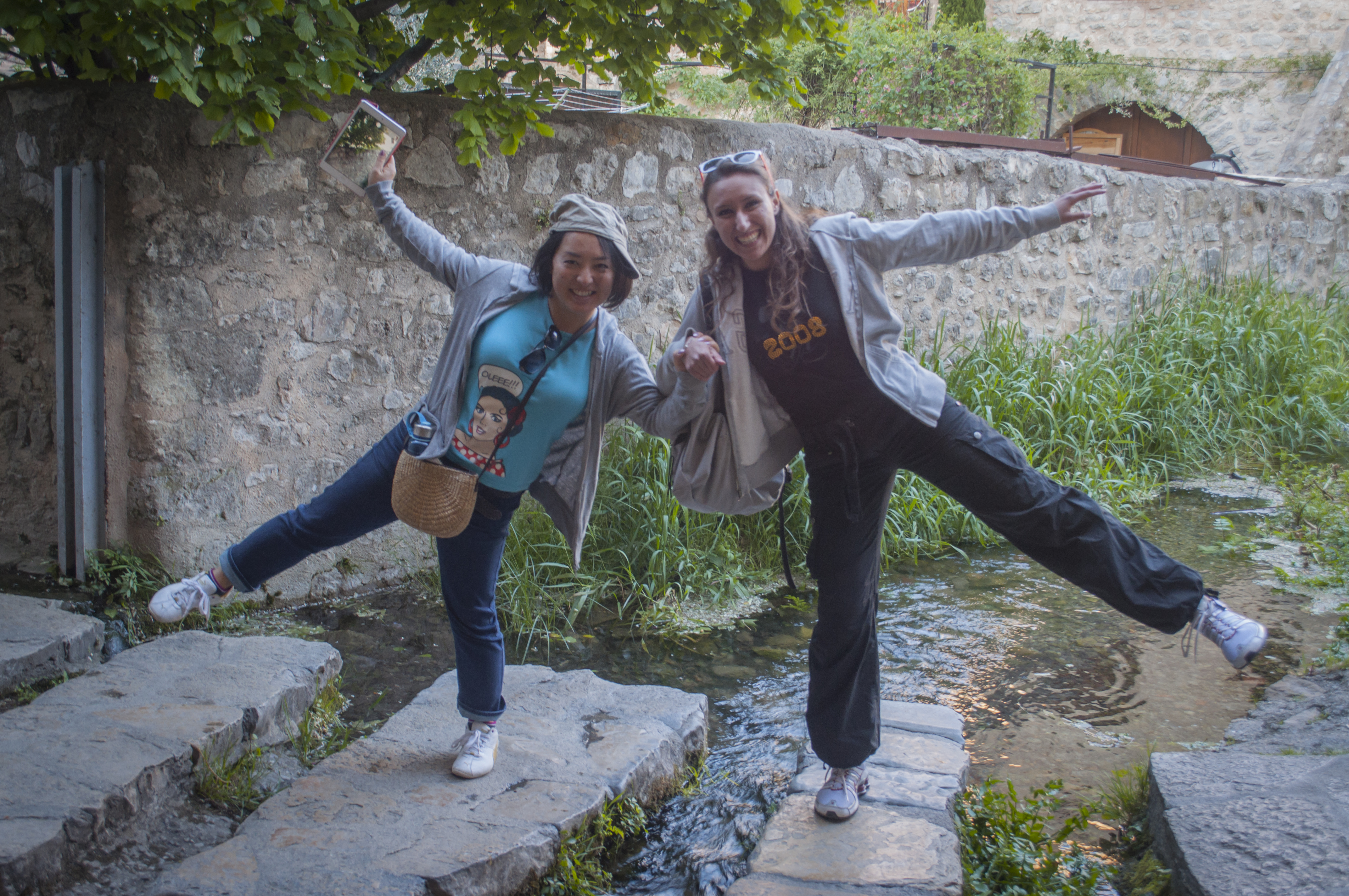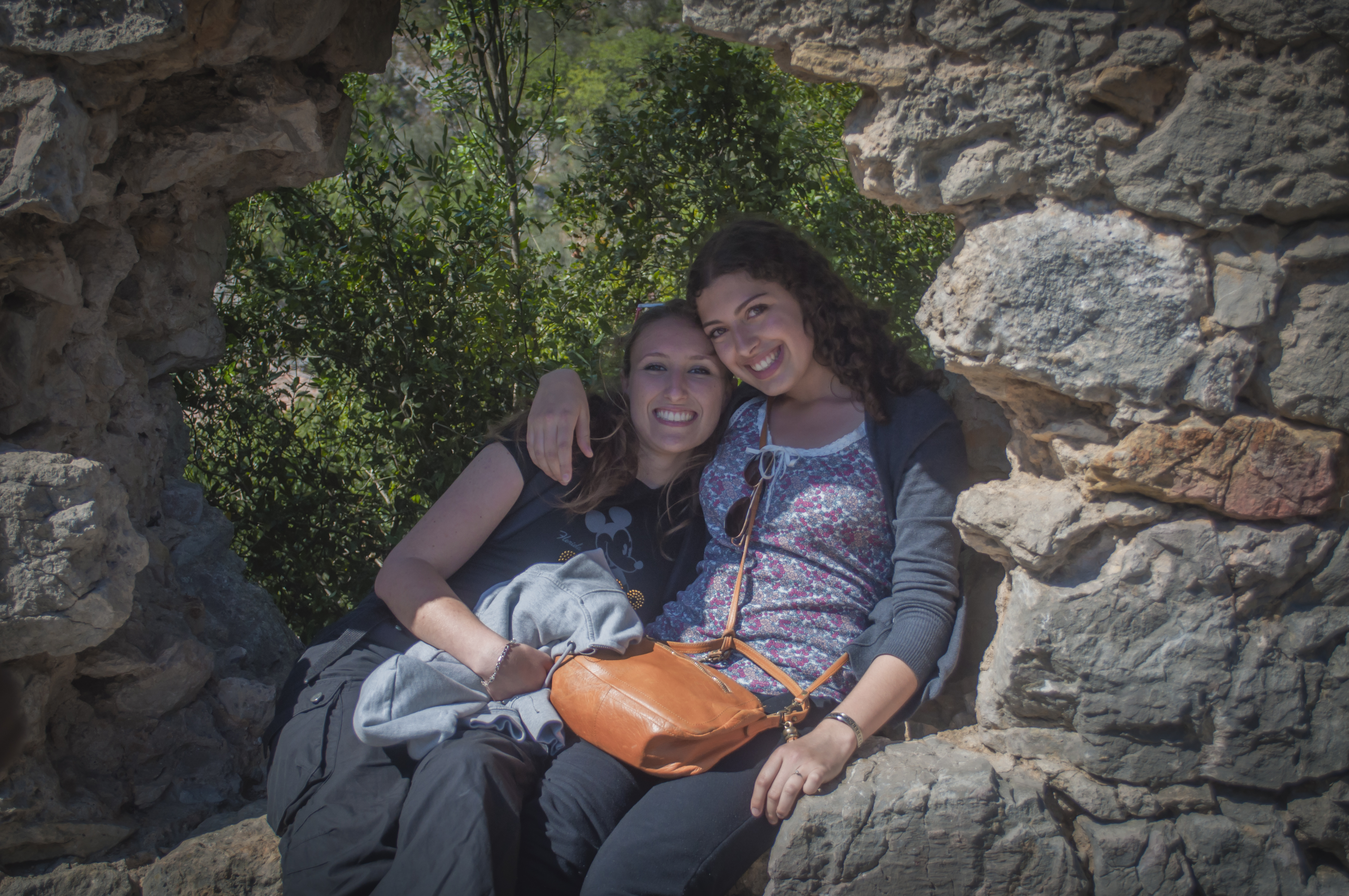 Just a little info on Saint-Guilhem Le Désert:  In the early 800’s C.E., a Duke by the name of Guilhem established this village.  The village’s beautiful location, as well as its well-preserved state, has it listed as one of the most beautiful villages in France.  In fact, the abbey (built in the 11th century) is a UNESCO World Heritage site.  We were super excited to explore this beautiful town.  Before exploring, however, our friends recommended doing a little hike behind the town up into the hills.  So our village walk turned into a bit of a hike.  No problem, right?  However, the trail sort of disappeared, and we soon found ourselves bouldering up some large rocks and castle ruins.  Not the walk we were expecting, but the beautiful views and fun times with friends make up for it!