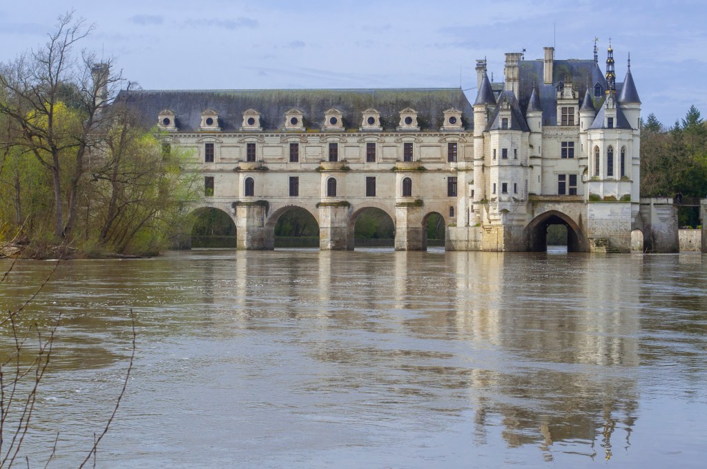 The Château de Chenonceau sits right on the Cher River, with surrounding forests and trees.
