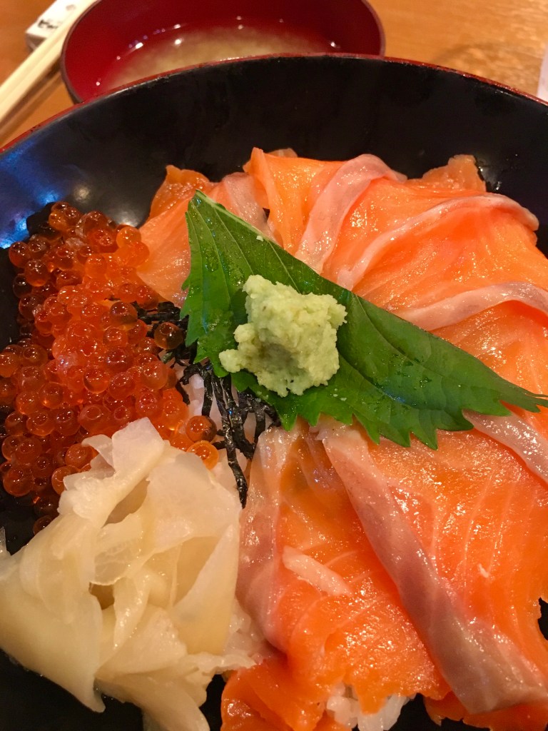 There’s no way I can post about Japan and NOT post about food. Although there’s no food at teamLab Borderless, there is a huge mall next door. Interestingly, the mall was very nice with a variety of shops, but it took quite a while before we actually found a Japanese restaurant! We walked past American, Italian, and Chinese restaurants – even a restaurant that specialized in beef tongue (!!!) – and finally we found one tucked into a corner at the far end of the mall. It wasn’t super cheap, but this restaurant had a deliciously fresh chirashi bowl with fresh salmon and salmon roe.