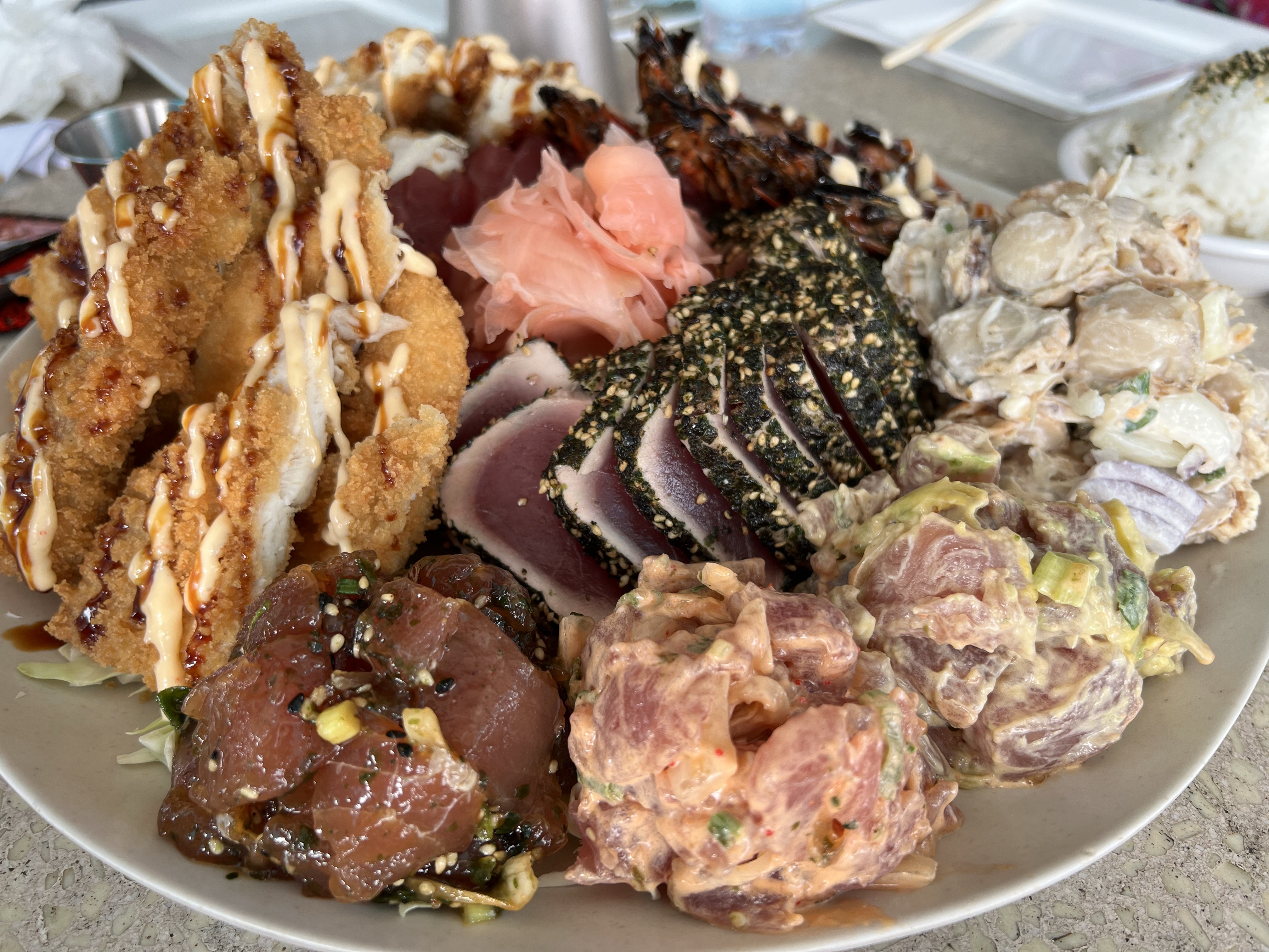 There are some great eating options on the Kona side of the Big Island. Our first meal on the island was supposed to be a snack, but ended up being a massive platter of Chicken Katsu, seared ahi tuna, shrimp, scallops and 3 types of poke. I highly recommend Umekes Fish Market Bar & Grill – there was a lot of variety and excellent, fresh poke.