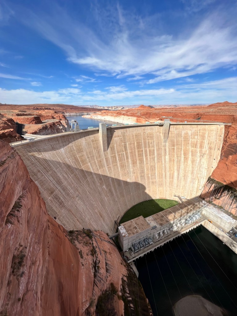 I’m usually more into natural beauty than manmade beauty, but with an empty afternoon, and not wanting to travel too far from our hotel that day, we ended up at Glen Canyon Dam. Glen Canyon Dam was built across the Colorado River in 1956 to provide equitable water distribution and power for the surrounding areas. It is the second highest concrete-arch dam in the US (the first is Hoover Dam).