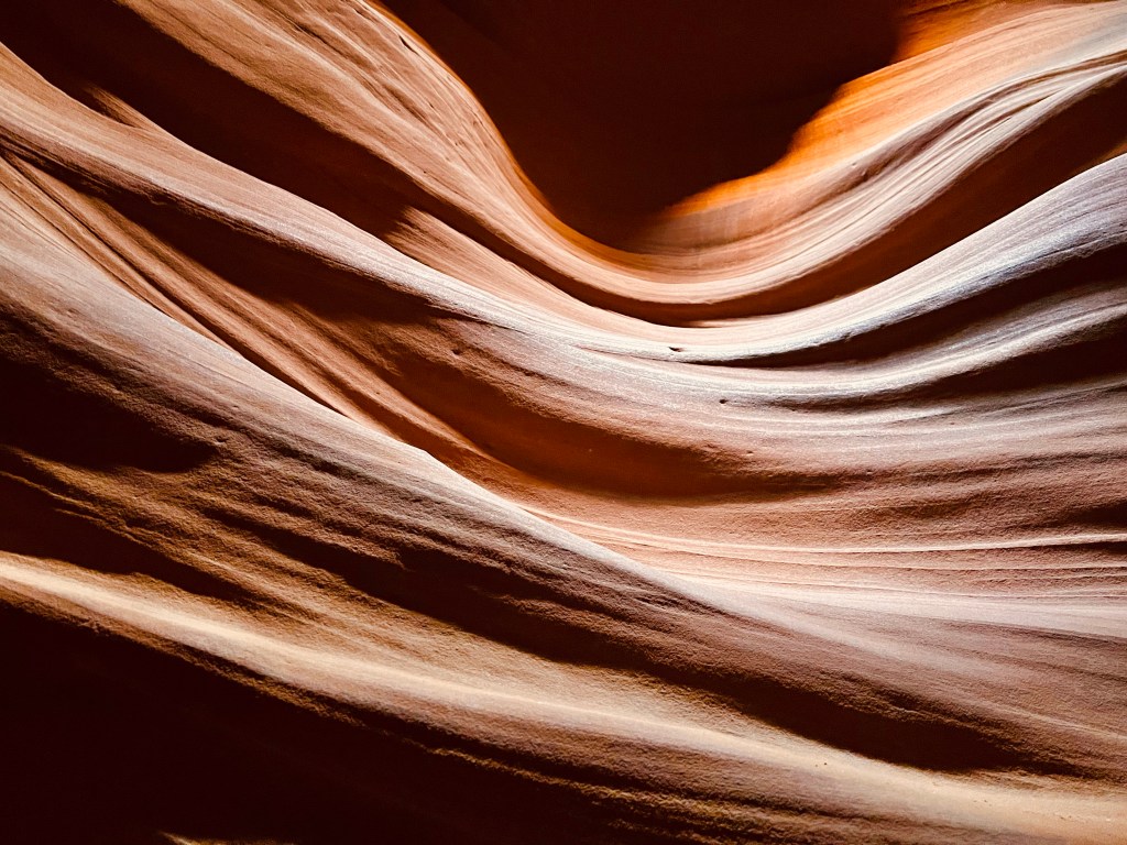 Our next stop was Upper Antelope Canyon. Because we were sharing this canyon with other tour groups, in contrast to Rattlesnake Canyon, we had to move quickly, with limited time to appreciate its beauty. The one good thing is that, because it was off-season, although we could hear other tour groups in the distance, we never actually saw anyone else. I’ve heard that it could get really crowded in the pre-COVID times, with tour groups practically on top of each other, but we didn’t experience this at all. Although we didn’t get as much natural light as we got at Rattlesnake Canyon, Antelope Canyon was even more stunning, with its smooth, flowing lines forming richer, colorful impressions throughout.