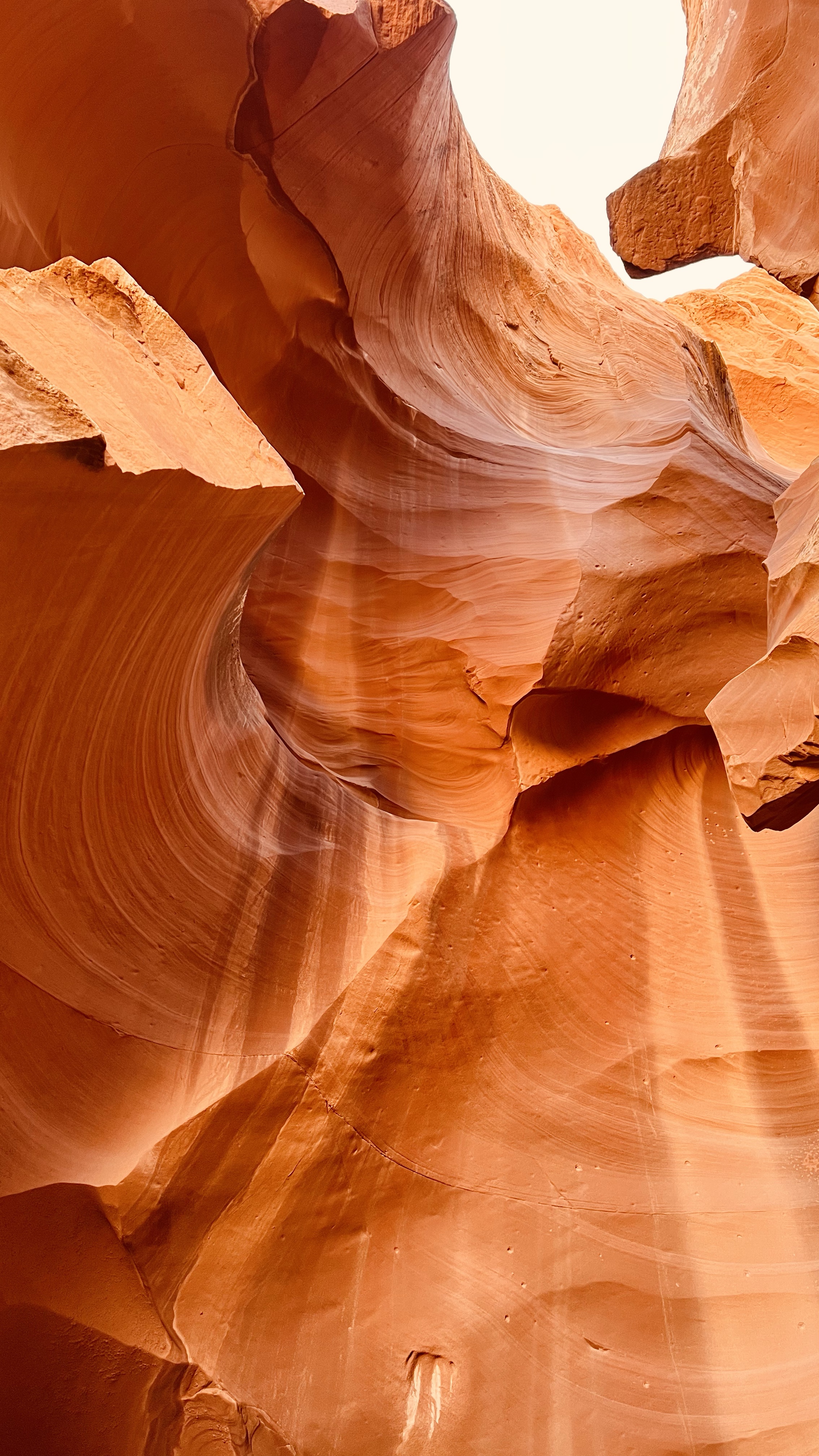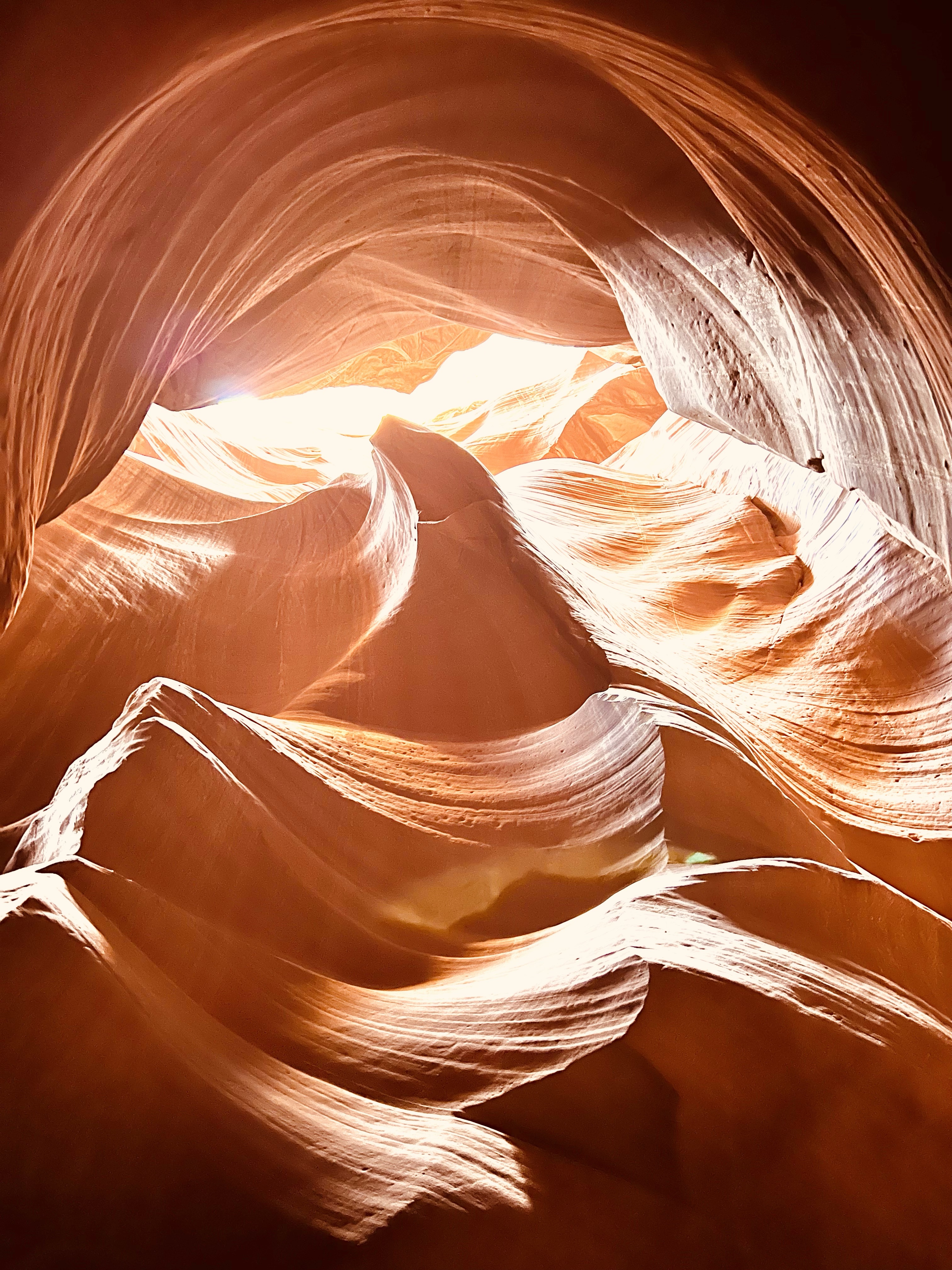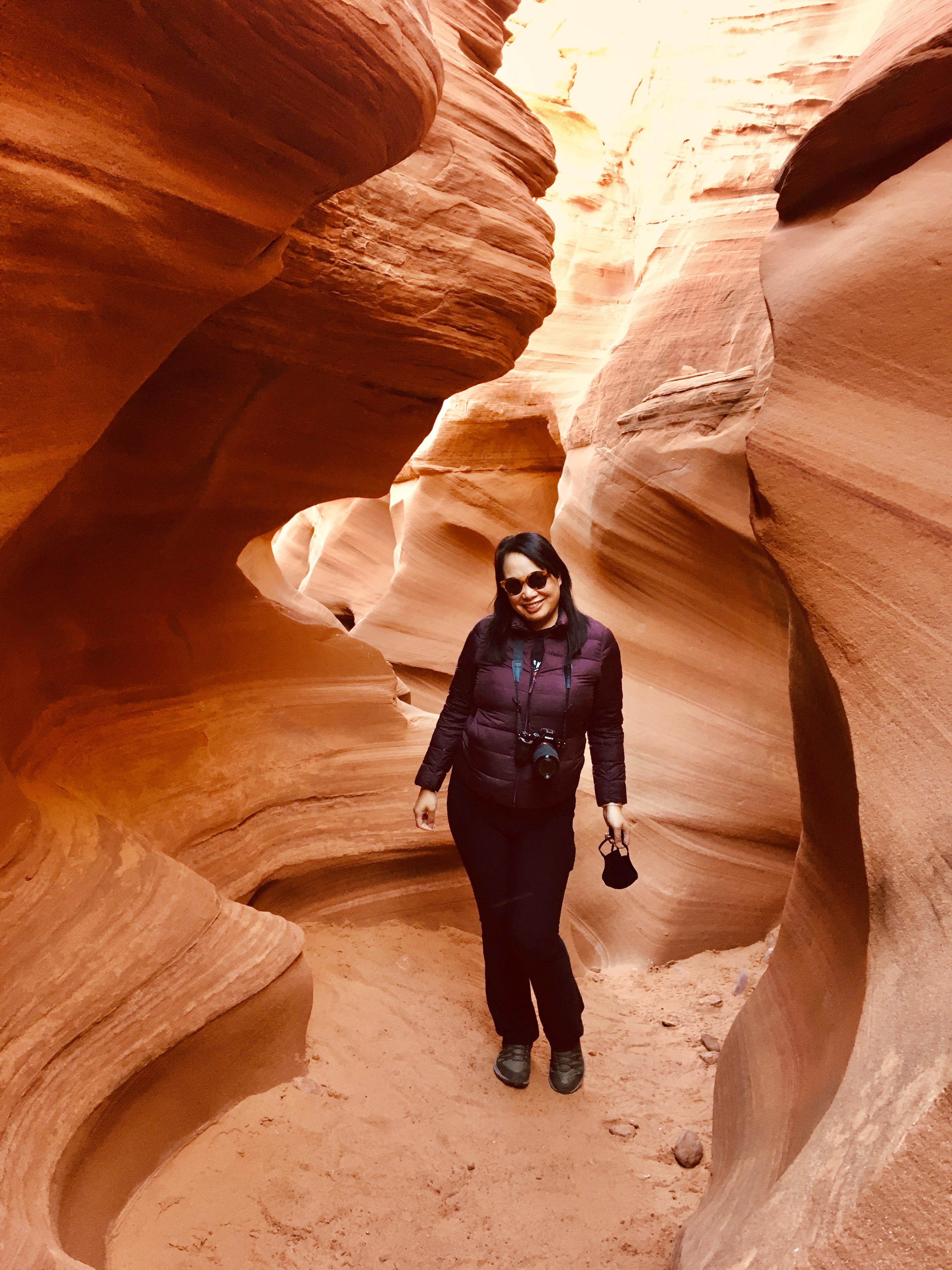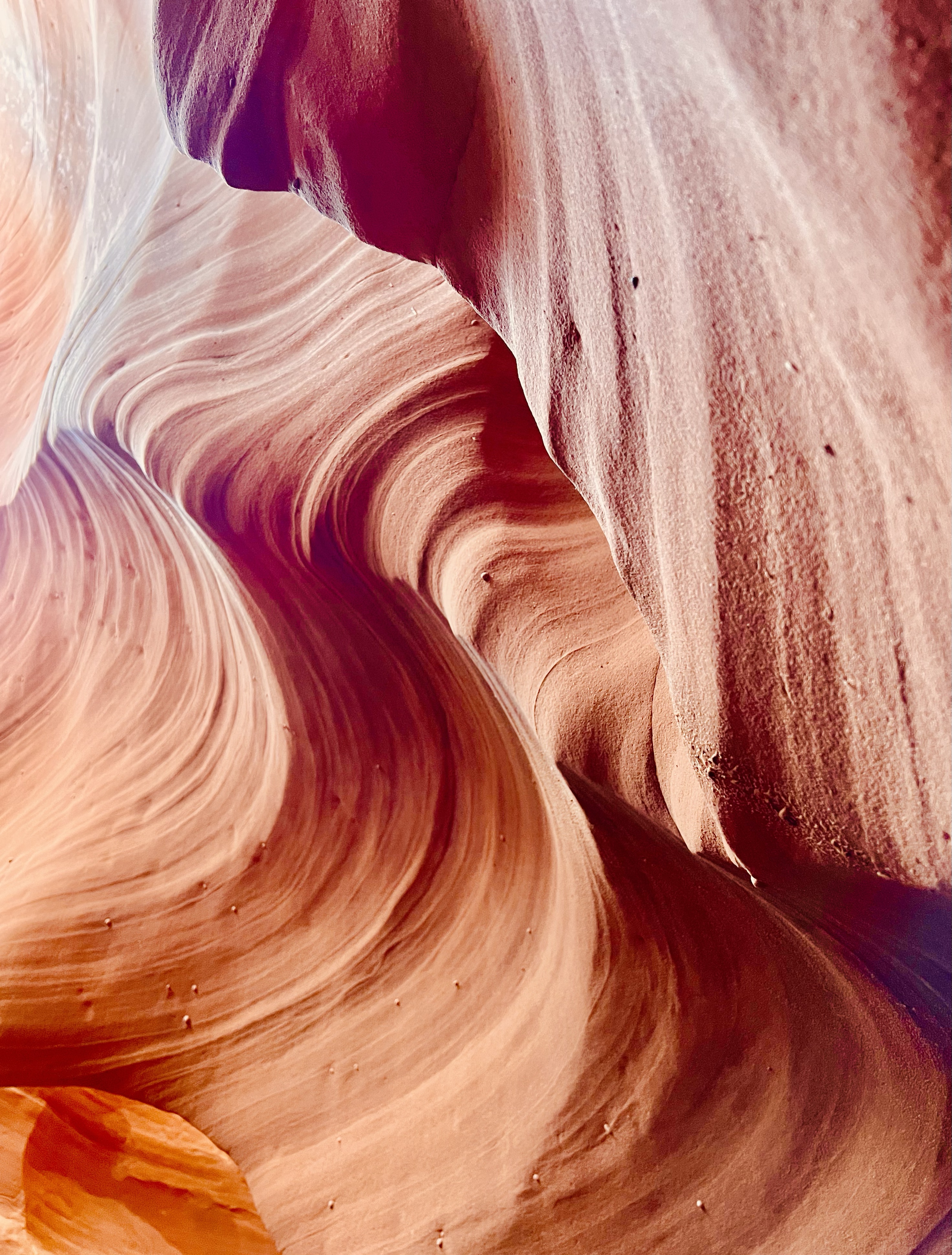 Our next stop was Upper Antelope Canyon. Because we were sharing this canyon with other tour groups, in contrast to Rattlesnake Canyon, we had to move quickly, with limited time to appreciate its beauty. The one good thing is that, because it was off-season, although we could hear other tour groups in the distance, we never actually saw anyone else. I’ve heard that it could get really crowded in the pre-COVID times, with tour groups practically on top of each other, but we didn’t experience this at all. Although we didn’t get as much natural light as we got at Rattlesnake Canyon, Antelope Canyon was even more stunning, with its smooth, flowing lines forming richer, colorful impressions throughout.